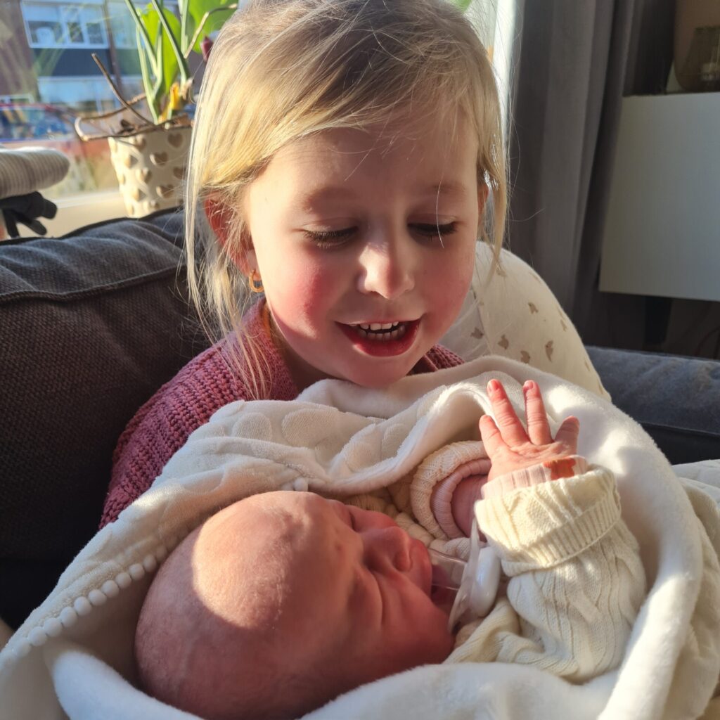Na 5 jaar opnieuw weer de dingetjes leren en ook zorgen dat met ons alles goed ging. Maar ook het entertainen en het betrekken van onze andere dochter nam ze goed op, deze kraamperiode heb ik kunnen genieten en mijn rust kunnen pakken, enorm fijne ervaring!!